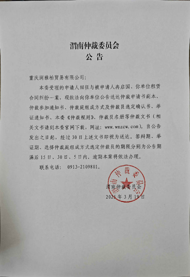 重慶潤(rùn)雅柏貿(mào)易有限公司、冉啟國與田征租賃合同糾紛案公告