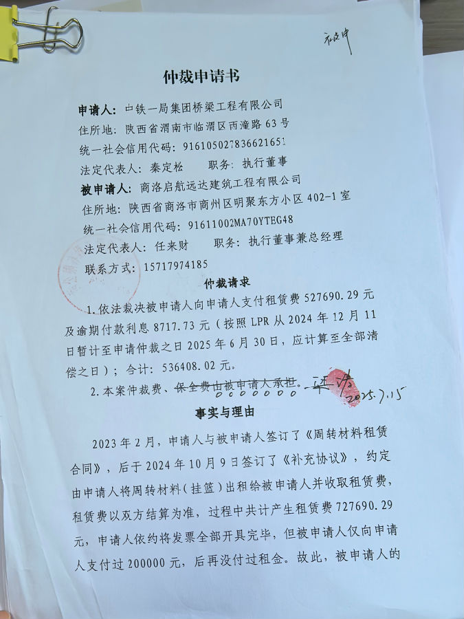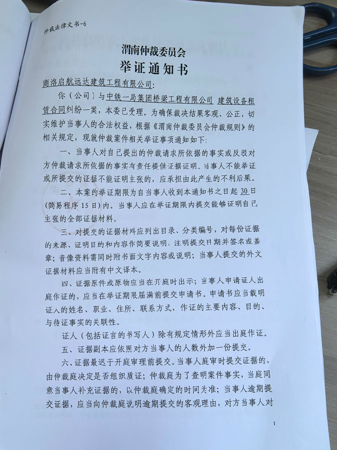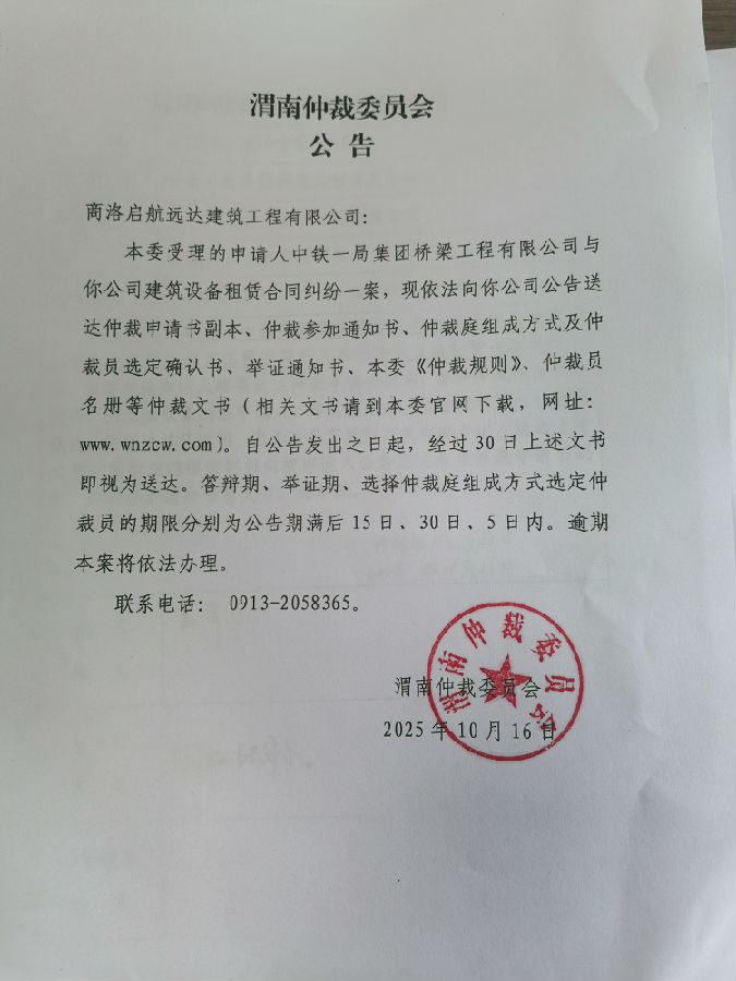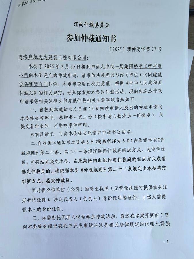 中鐵一局集團橋梁工程有限公司與商洛啟航遠達建筑工程有限公司建筑設(shè)備租賃合同糾紛案公告
